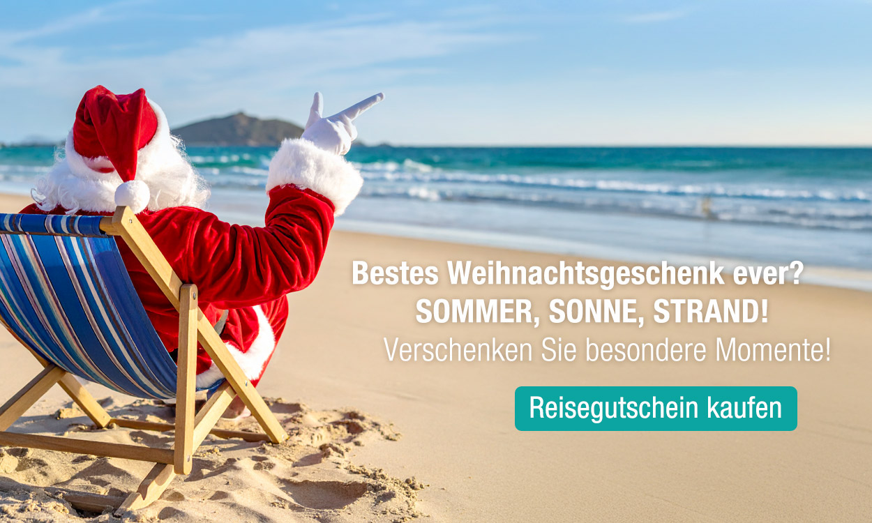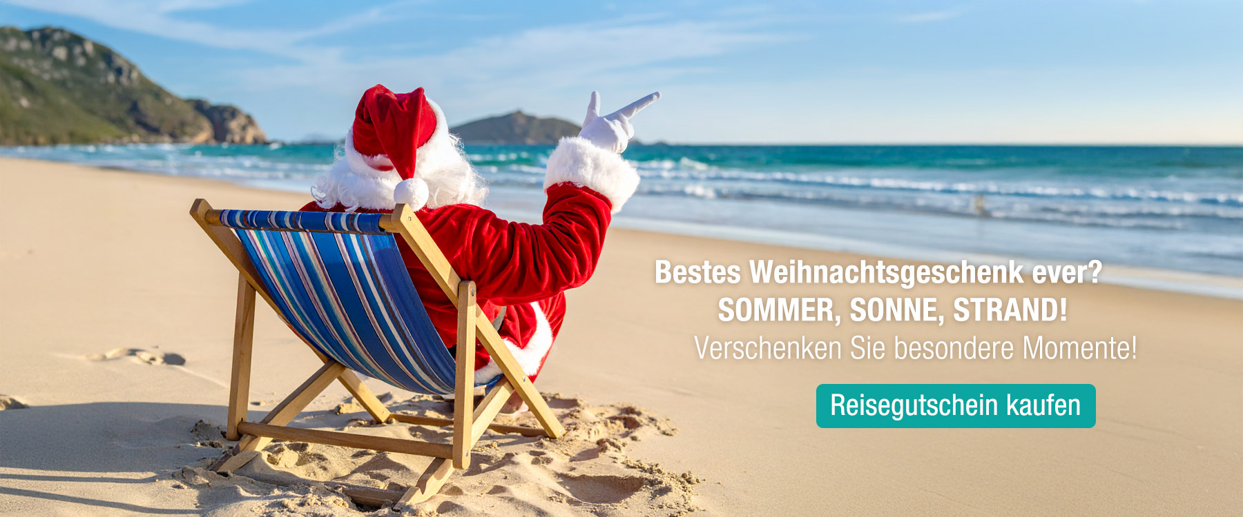 Weihnachtsmann in rotem Anzug sitzt im Liegestuhl am Sandstrand mit dem Meer im Hintergrund und deutet auf den Text "Reisegutschein kaufen" für Sommer, Sonne, Strand.