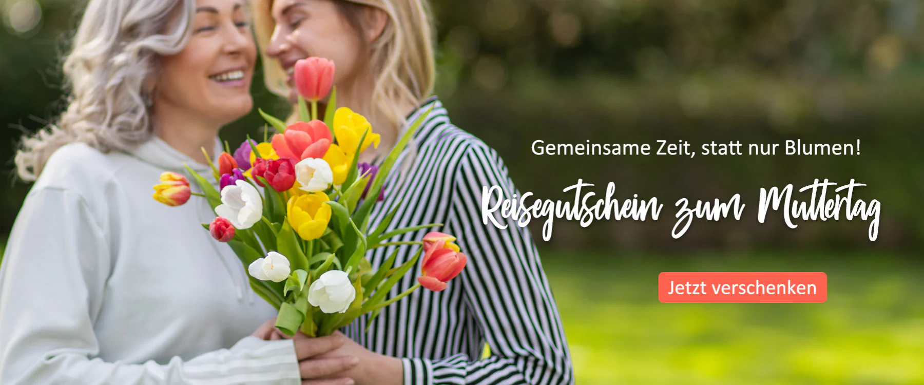 Zwei lächelnde Frauen mit einem bunten Tulpenstrauß vor grünem Hintergrund. Text: Reisegutschein zum Muttertag. Orangener Button: Jetzt verschenken.
